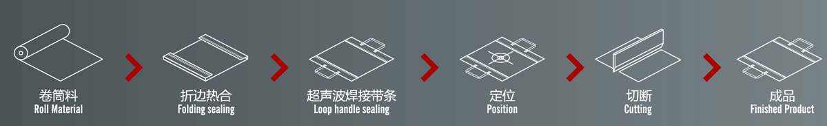 2.本機(jī)通過(guò)折邊后,再經(jīng)過(guò)左右兩臺(tái)燙把機(jī)把雙手提條焊好,裁切出來(lái)。